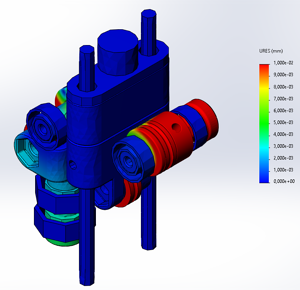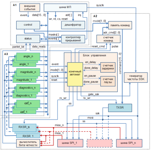 Conclusions. The results show that the synthesized microprocessor system, which includes PWM signal generators for controlling drives, an AS5048A encoder polling component, data reception devices and an interrupt signal, make it possible to implement control signal generation modules for drives and strain gauge polling machines in real time. The use of FPGAs makes it easy to scale the resulting solution without reducing the overall system performance and significantly reduces the load on the top-level computer.